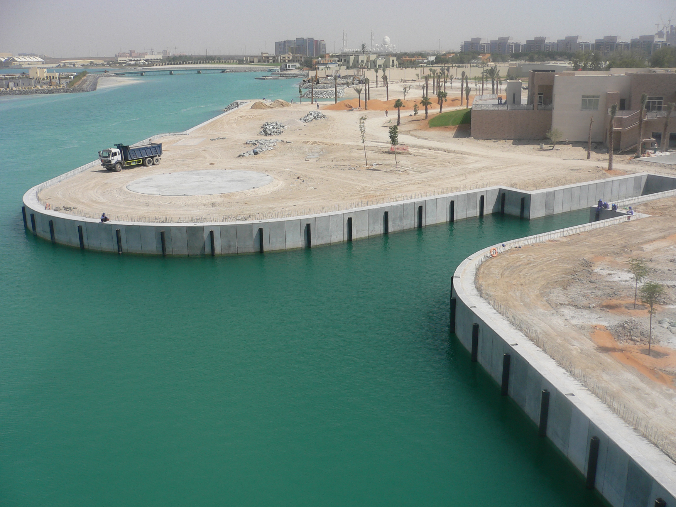 Sheet pile quay around marina basin, rock revetment, beach area, excavation of marine basin and installation of two floating pontoons